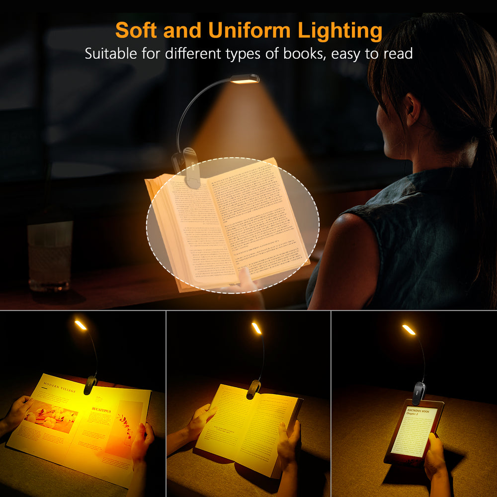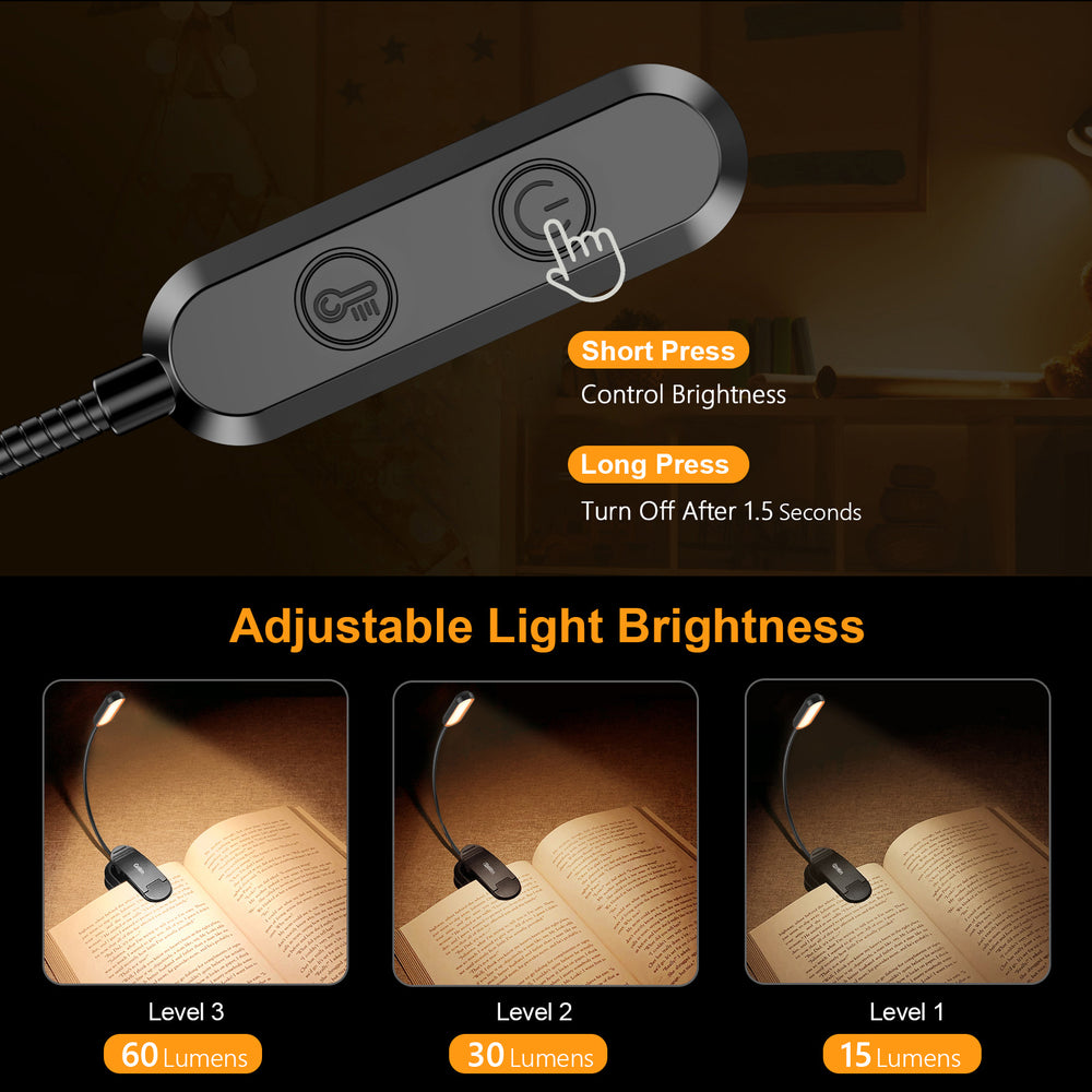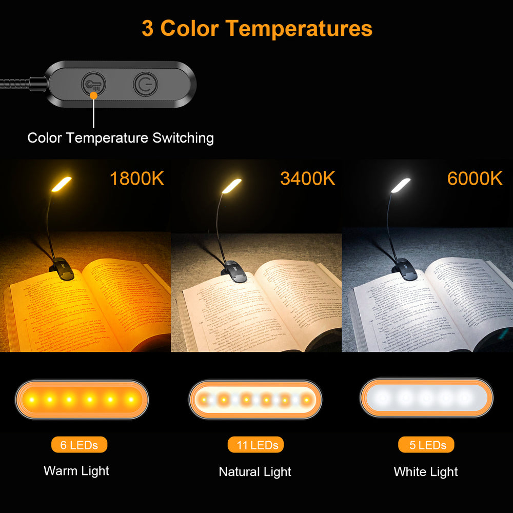 💡【3 Colors Stepless Dimming】The reading light has 3 color temperature modes: mixed light (3400K), white light (6000K), amber light (1800K). Short press the button to easily switch the lighting mode; long press the button to achieve stepless dimming (10%-100%). The book light has a brightness and color temperature memory function, so you can easily get the color temperature and brightness combination your need to adapt to different reading environments.