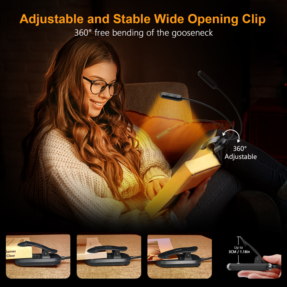 💡【360°Flexible Gooseneck Tube】 The 360°flexible gooseneck tube is made of metal, which can be rotated to any angle and easily folded for easy storage and carrying. The clip opening is equipped with a non-slip pad, which can be firmly fixed on e-readers, books, shelves or any other object surface without slipping. It also leaves no clip marks, which can protect your beloved books from being scratched or squeezed.