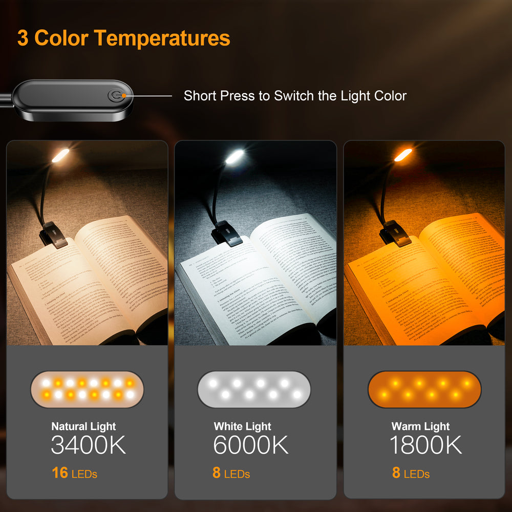 💡【Stepless Dimming & 3 Modes】The reading light has a total of 16 LED light beads. 3 Color Temperature Modes: Mixed Light/White Light/Amber Light. Short press the button to change the mode, long press the button to adjust the brightness from 10% to 100%. You can easily achieve the desired combination of color temperature and brightness to meet different reading environments and lighting needs.