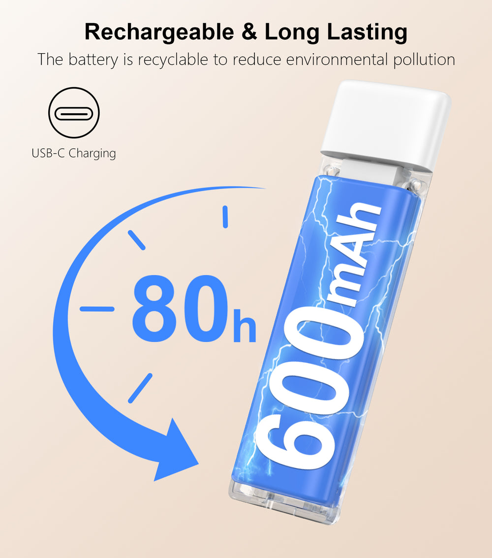 1000mAh Rechargeable Battery: About 2.5 hours to full charge; up to 80 hours at the lowest brightness; 4-LED power indicators; USB charging cable included.
