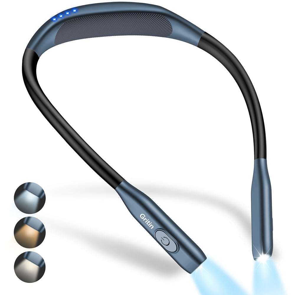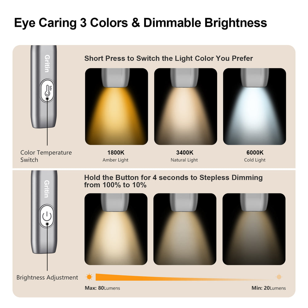 【3 Color Temperatures & Stepless Dimming】Gritin neck reading light is equipped with 3 color temperatures: amber light (1800K)-warm white light (3400K)-white light (6000K), short press the color temperature button to easily switch color modes. Long press the switch button for stepless dimming, which can be freely switched between 10% and 100%. With brightness/color temperature memory function, turn on the light again will keep the color temperature/brightness before closing.