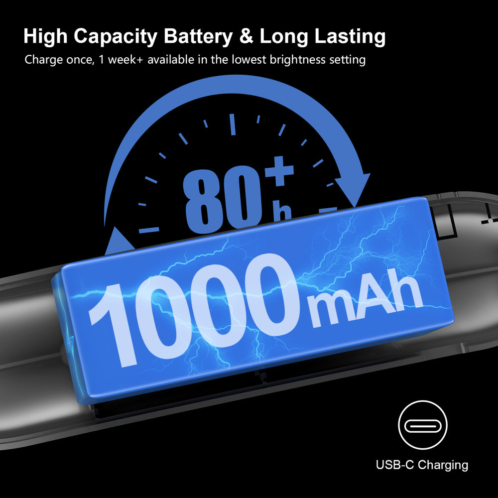 【USB C Rechargeable & Long-Lasting】Built-in 1000mAh rechargeable battery, it only takes 2-3 hours to be fully charged with the included Type-C charging cable, supports repeated charging, economical and environmentally friendly. It can support up to 8-80 hours of lighting after fully charged, and the long battery life saves you from the trouble of frequent charging. At the same time, it also has a thoughtful 4 LED indicator light, convenient to know the power consumption at any time.