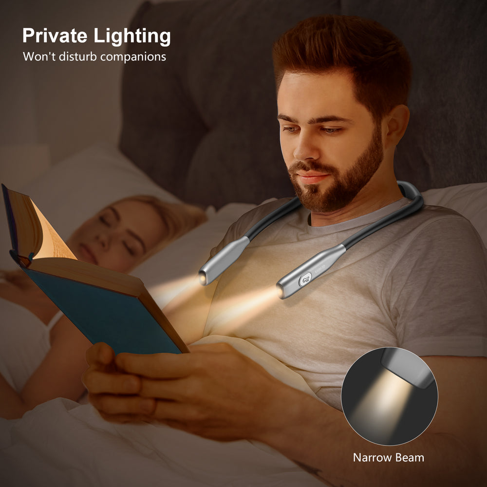 【Multi-Scenario Use】This neck reading light is compact and foldable, easy to carry, perfect for enjoying night reading in bed, car or traveling, also suitable for sewing, knitting, mending, even outdoor camping, barbecuing, walking the dog, jogging at night. It's a great gift for your lover, your kids, your parents and your friends.