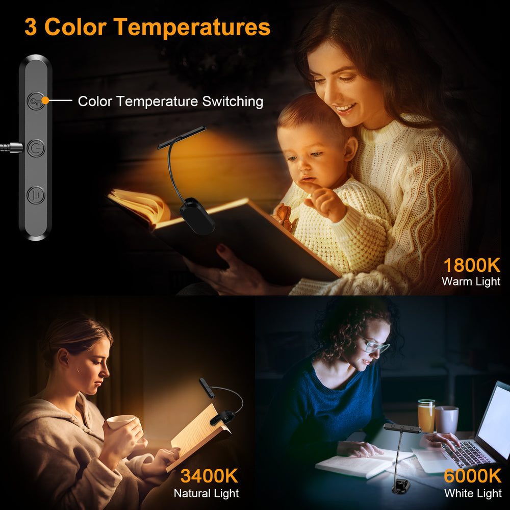 【3 couleurs et 5 niveaux de luminosité】La lampe de lecture Gritin est équipée de 3 températures de couleur : lumière mixte (3400K) - lumière blanche (6000K) - lumière ambre (1800K), appuyez brièvement sur le bouton de température de couleur pour changer facilement le mode de couleur ; en même temps avec 5 niveaux de luminosité, peut être librement ajusté en fonction des différents besoins environnementaux, formant une variété de combinaisons de lumière pour répondre aux besoins d'éclairage de différentes scènes ; avec fonction de mémoire de luminosité/température de couleur.
