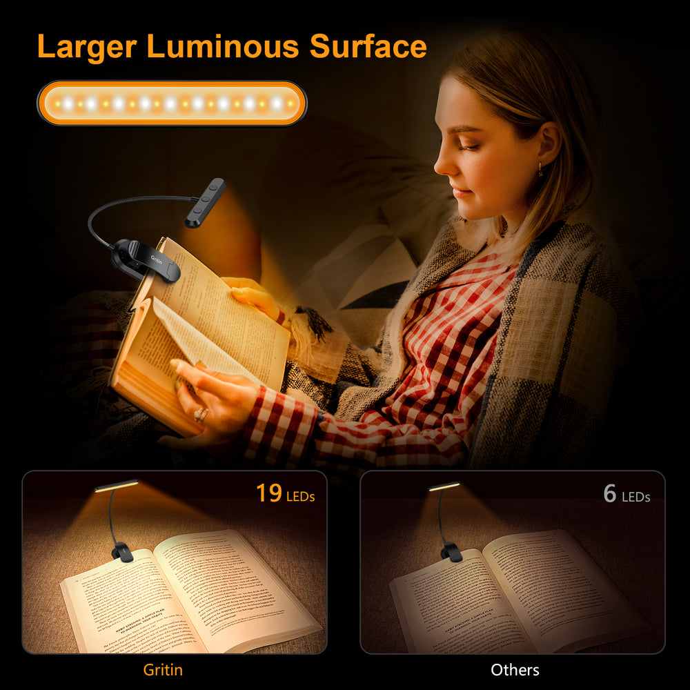 【Conception horizontale unique et protection des yeux】La lampe de lecture Gritin utilise une conception de tête horizontale unique avec une plage d'éclairage plus large pour vous fournir un éclairage stable et suffisant, vous permettant de profiter pleinement de votre temps de lecture sans déranger le sommeil de votre partenaire ou colocataire. 19 perles LED de haute qualité disposées en séquence + la couverture en matériau ABS peuvent émettre une lumière uniforme et douce, sans scintillement ni ombre, ce qui peut protéger vos yeux au maximum même lorsque vous lisez la nuit.