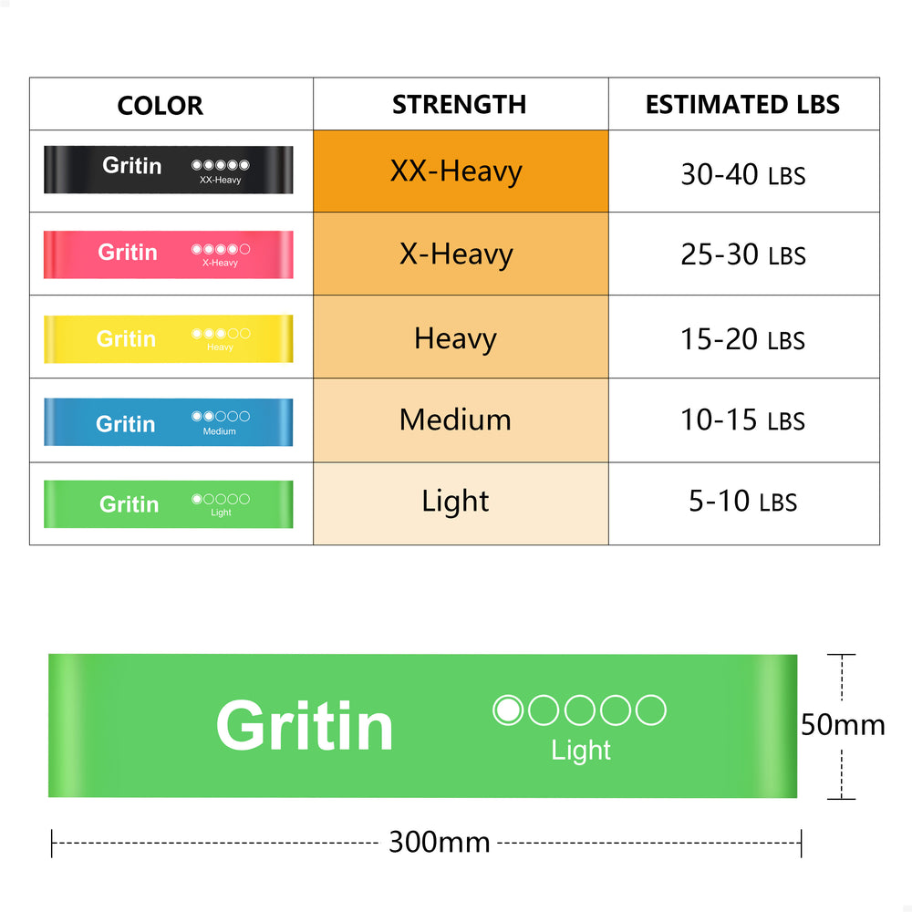 【What You Get】5X Gritin resistance bands with different level , 1X portable storage bag and 1x Manual in six languages.